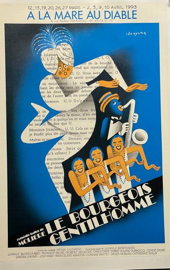This poster was created to promote a production of Molière's play, Le Bourgeois Gentilhomme, a 5 act comedy about the Middle-Class Aristocrat'', or 'Would-Be Noble''. The play, intermingled with music, dance and singing, satirizes attempts at social climbing poking fun both at the vulgar, pretentious middle class and the vain, snobbish aristocracy.