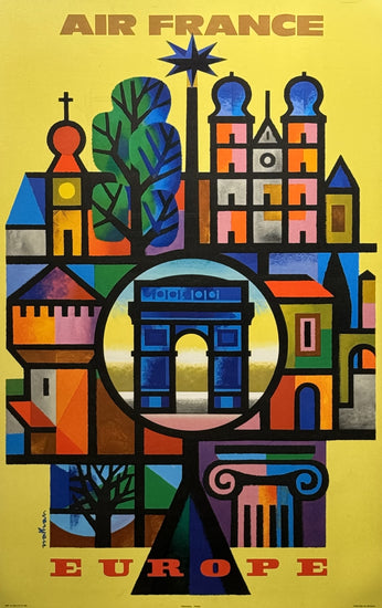 I-Spy the Arc de Triomphe, a much-photographed landmark in one of our favourite cities - take a closer look and see if your favourite city is here. Jacques Nathan-Garamond has included iconic images of well-loved European destinations in this poster, commissioned by Air France V, to promote travel to Europe. Its bold colours and interesting subject matter will encourage lively retelling of favourite travel stories amongst your guests.
