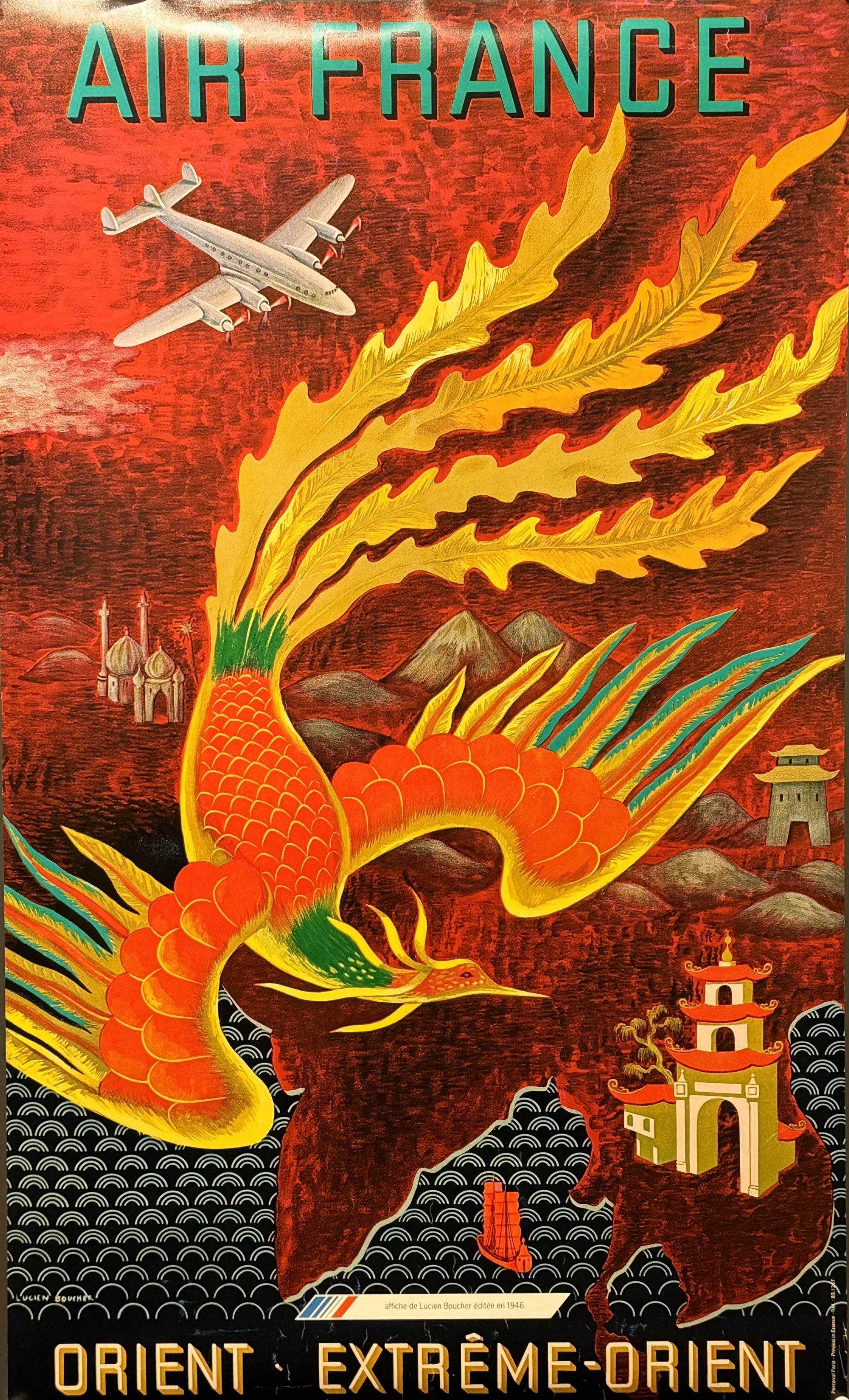 Superimposed over a map of Asia, showing the Taj Mahal, pagodas and the majestic snow-capped peak of Mt Everest, soars the mythical phoenix with it's brilliant scarlet and gold plumage. Set on a stunning red background, this poster encapsulates the quintessential Asia, inviting its viewer to venture into the mysteries of the Orient and the Far East.