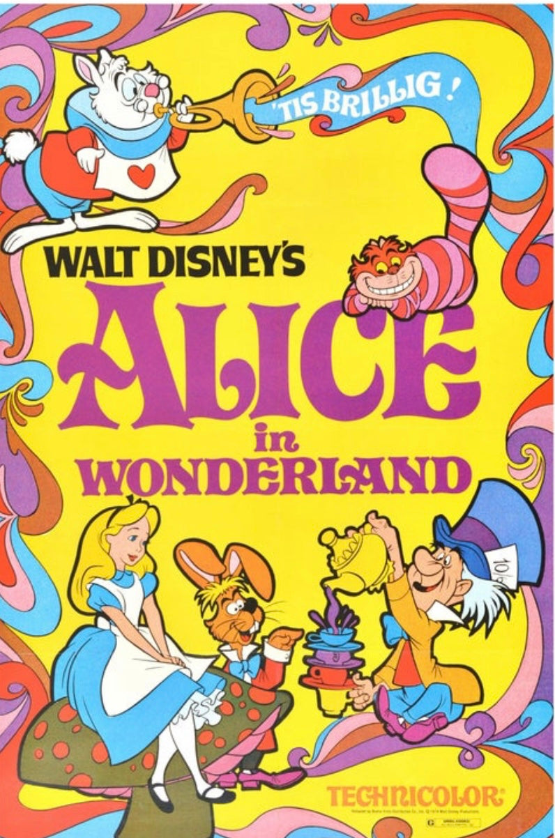 This colourful print from the 1981 re-release of the beloved Lewis Carroll classic features all of the familiar characters; Alice sitting on a mushroom being served tea by the Mad Hatter, the March Hare standing behind Alice and pointing to the four cups that the Hatter is balancing, the White Rabbit blowing out the slogan caption from his trumpet and the Cheshire cat grinning as he watches on.