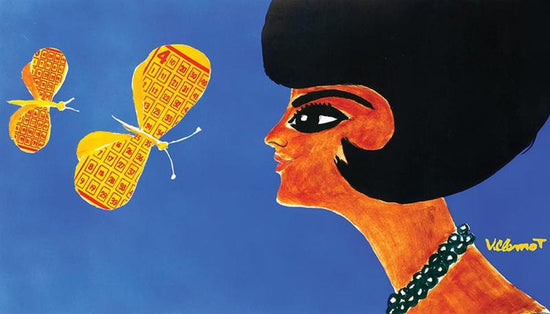 Villemot's poster for the Parisian Lottery before the text was added. This poster on a stunning blue background uses the Loto tickets as the texture in the yellow butterflies wings.