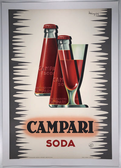 In a groundbreaking design move, Futurist designer Fortunato Depero turned the serving glass upside down to create the shape of the Campari Soda bottle. This innovative and award-winning design is reflected in this mid-century poster. The unique red colouring of Campari Soda (created using carmine dye) and simplistic design gives the poster a striking appeal.