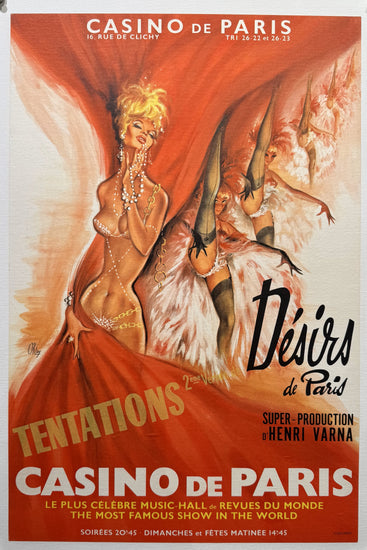 Oozing sensuality and sexual desire this poster for Casino De Paris, one of the well-known Paris music halls, depicts scantily clad dancers performing the famous Can Can. The "Désirs de Paris" review was performed between 1966 and 1968 and was directed by Henri Vama.