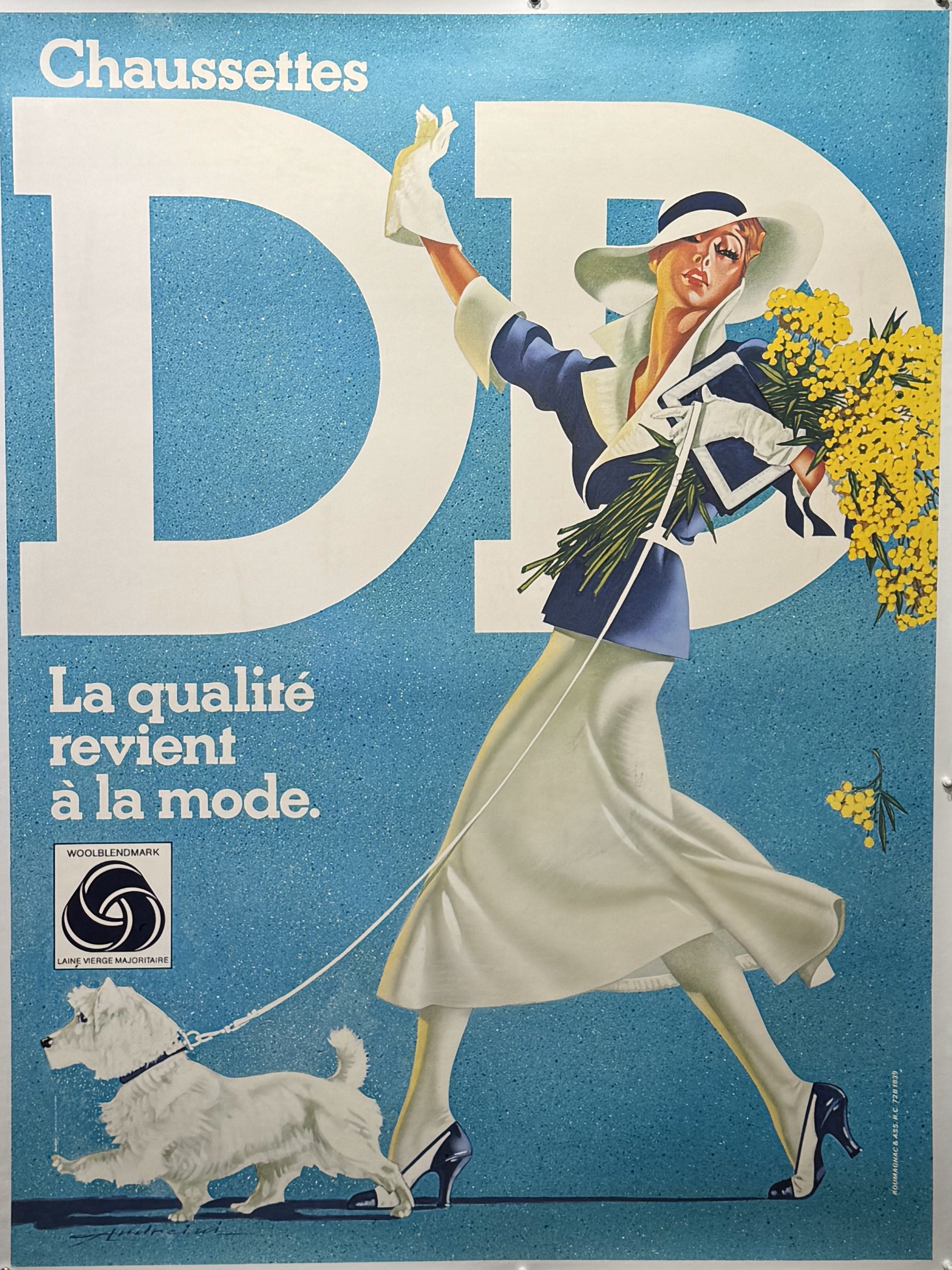 Perfectly completing her elegant navy and white ensemble, our fashionista wears her Doré Doré Chaussettes white tights teamed with navy and white shoes and hat (we love a hat here at Purple Zebra), proving that "quality is back in fashion". She carries a bunch of golden wattle (a nod to the Australian wool used) as she takes a stroll with her handsome pooch.