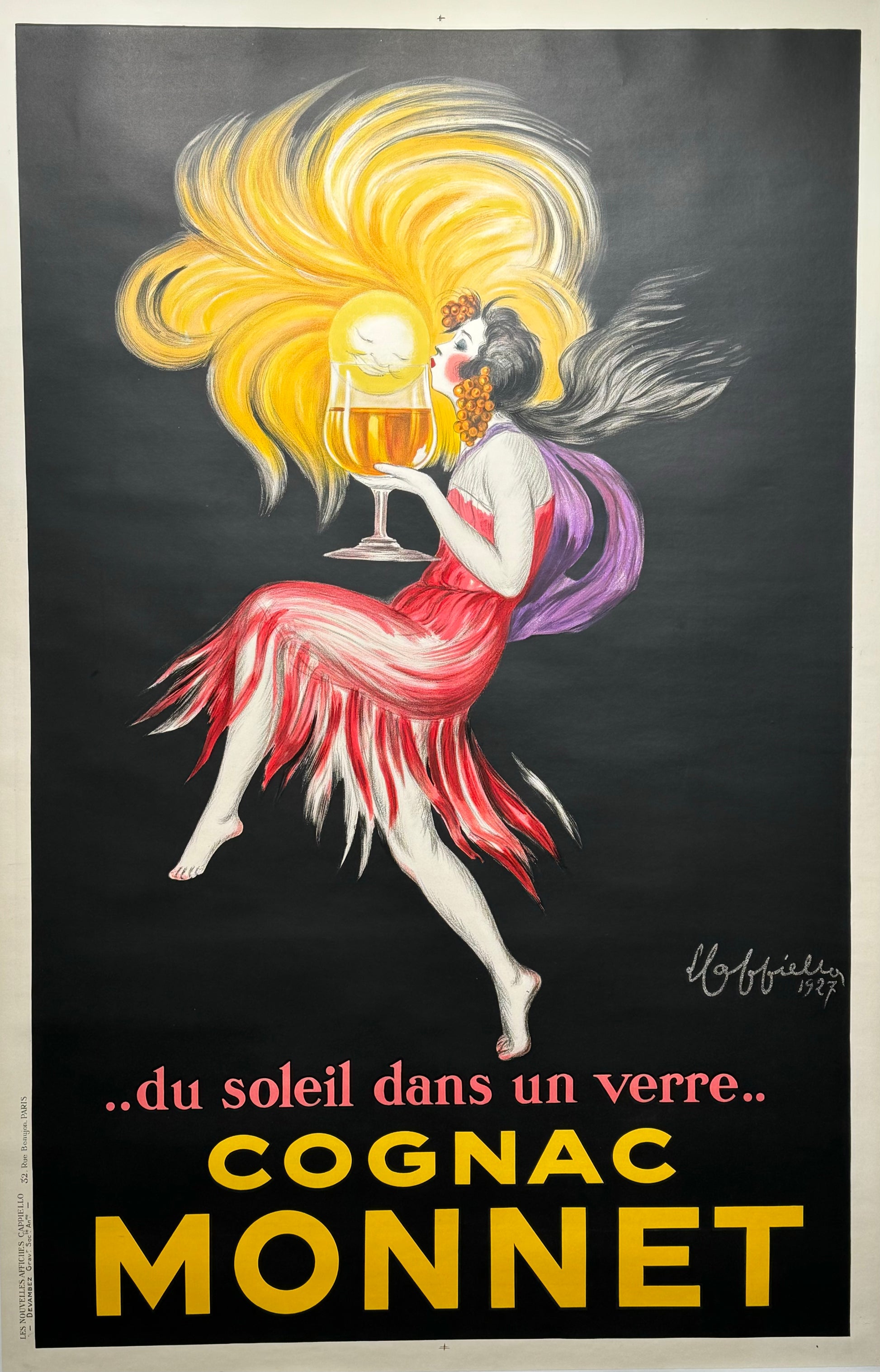 In his signature uncomplicated style Cappiello has pictured a graceful 'flapper', in her red dress with a purple boa, sipping from her oversized glass, enjoying Monnet Cognac the liquid that warms you like the sun. The text below reads "du soleil dans un verre" - "a sun in the glass," drawing a clear metaphor.