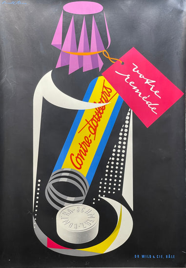 Your remedy against pain - Swiss pain relief in a bottle. A vibrant image on a classic black background. Brun