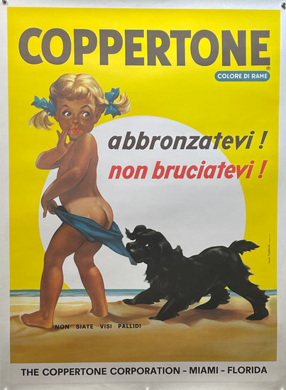 Coppertone was originally invented as a lotion to darken tans. At that time, the company introduced the Coppertone girl (or Little Miss Coppertone). As depicted here, she is a pigtailed cutie who has been surprised by her puppy who is tugging at her swimsuit to reveal her tan line.