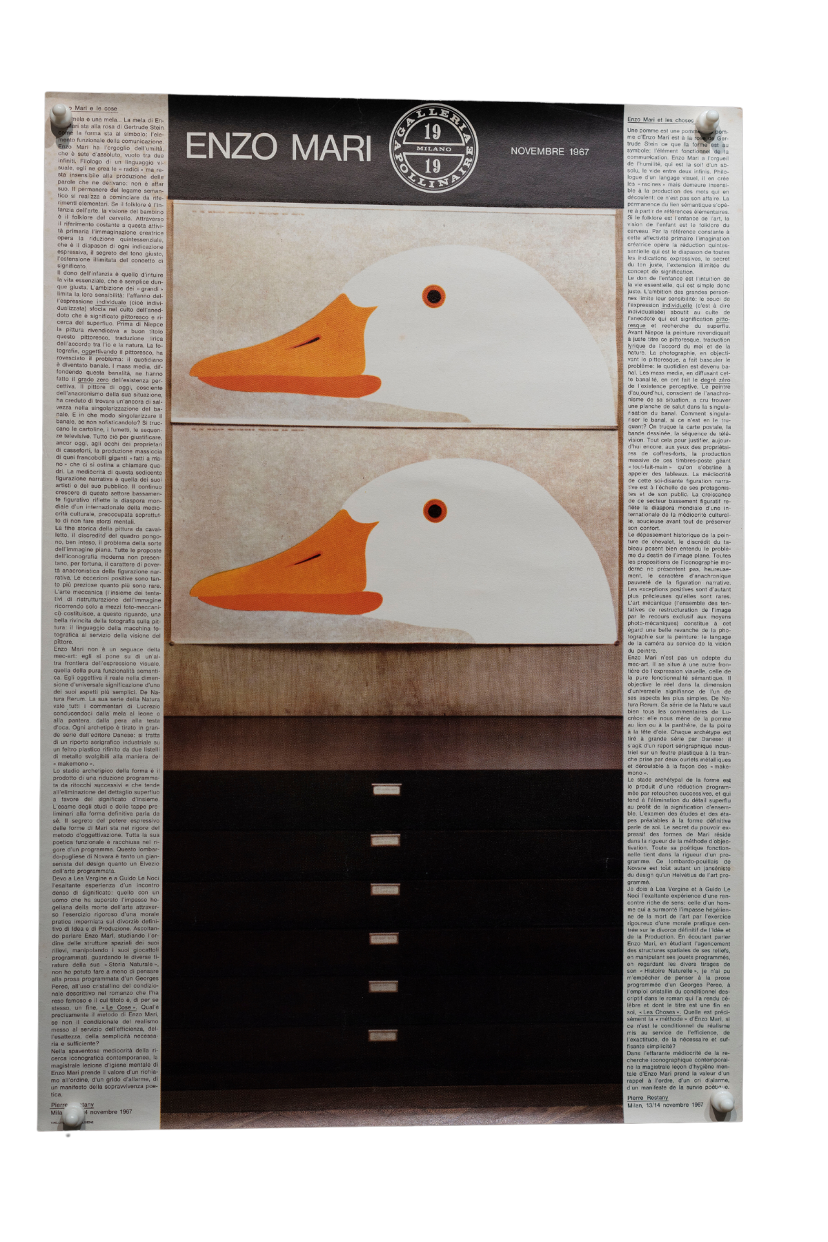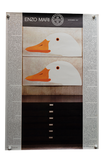 This unusual poster captures Enzo Mari's image of ducks and appears to be an advertisement for an exhibition of his work to be held in November 1969 at Galleria Pollinaire.