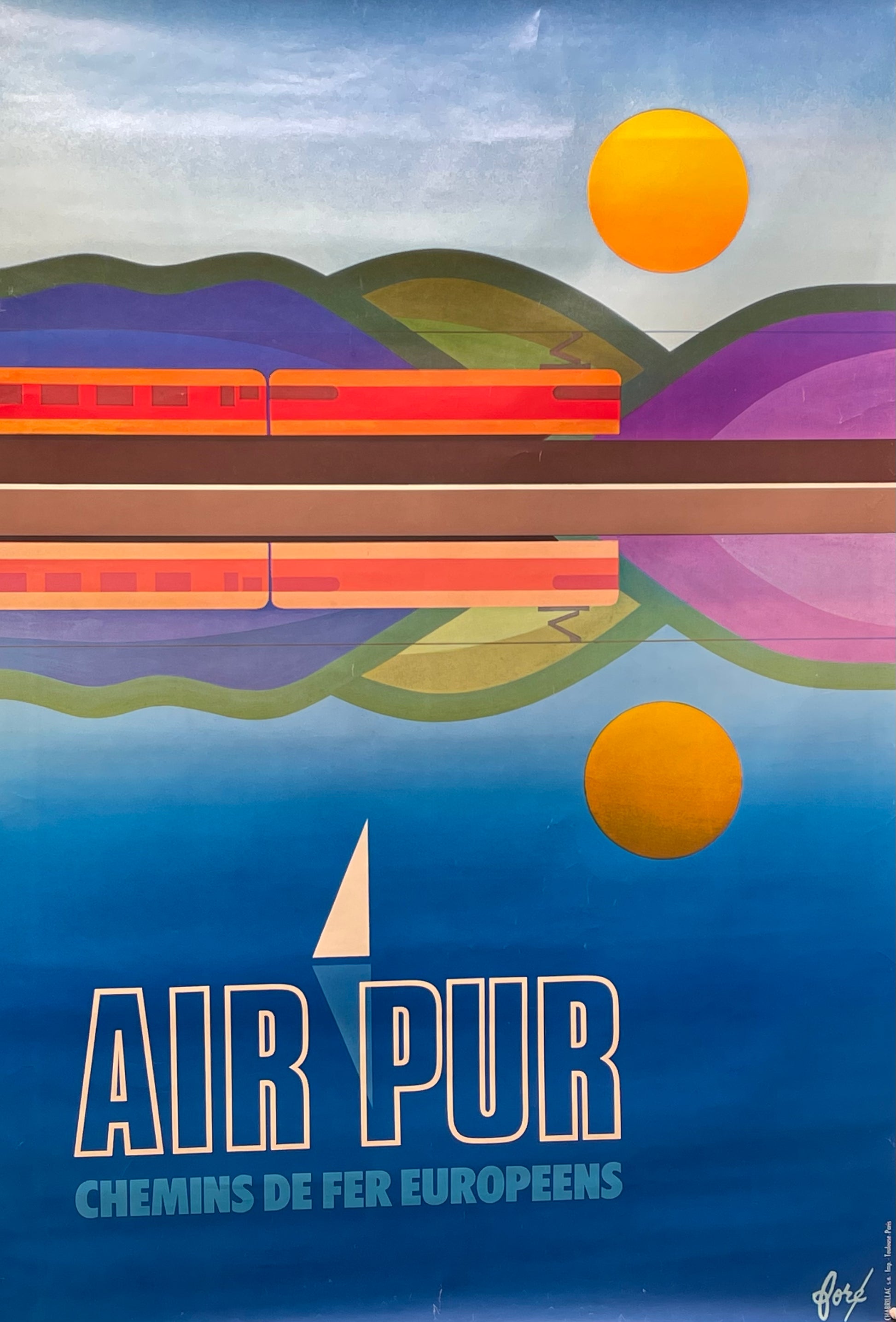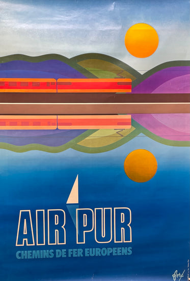 Travel back in time with the Air Pur! This vintage-inspired poster brings back the days of European rail travel when the air was pure. See the glorious mountains and glowing sun reflected in the pure lakeside waters and envisage escaping to the fresh air of Europe. Hop aboard the train and dream of happy days.