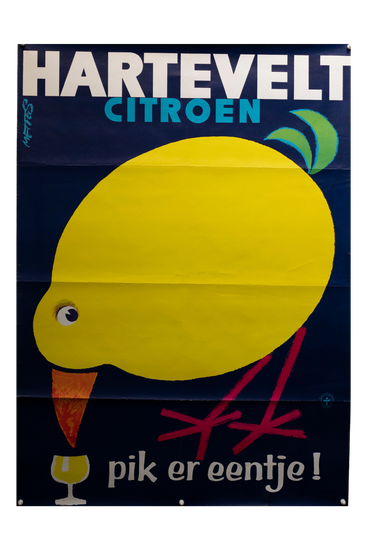 Quench your thirst for retro flair with this Hartevelt Citroen poster! This bright yellow bird grabs your attention with its catchy style and bold color (mimicing the lemon used in the Hartevelt Citroen). It will make a statement in any room.