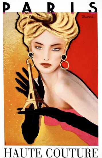 This particular image was created to promote the Haute Couture (high fashion), symbolized by Paris and the iconic Eiffel Tower. The design is in the contemporary art deco style that Razzia is known for.