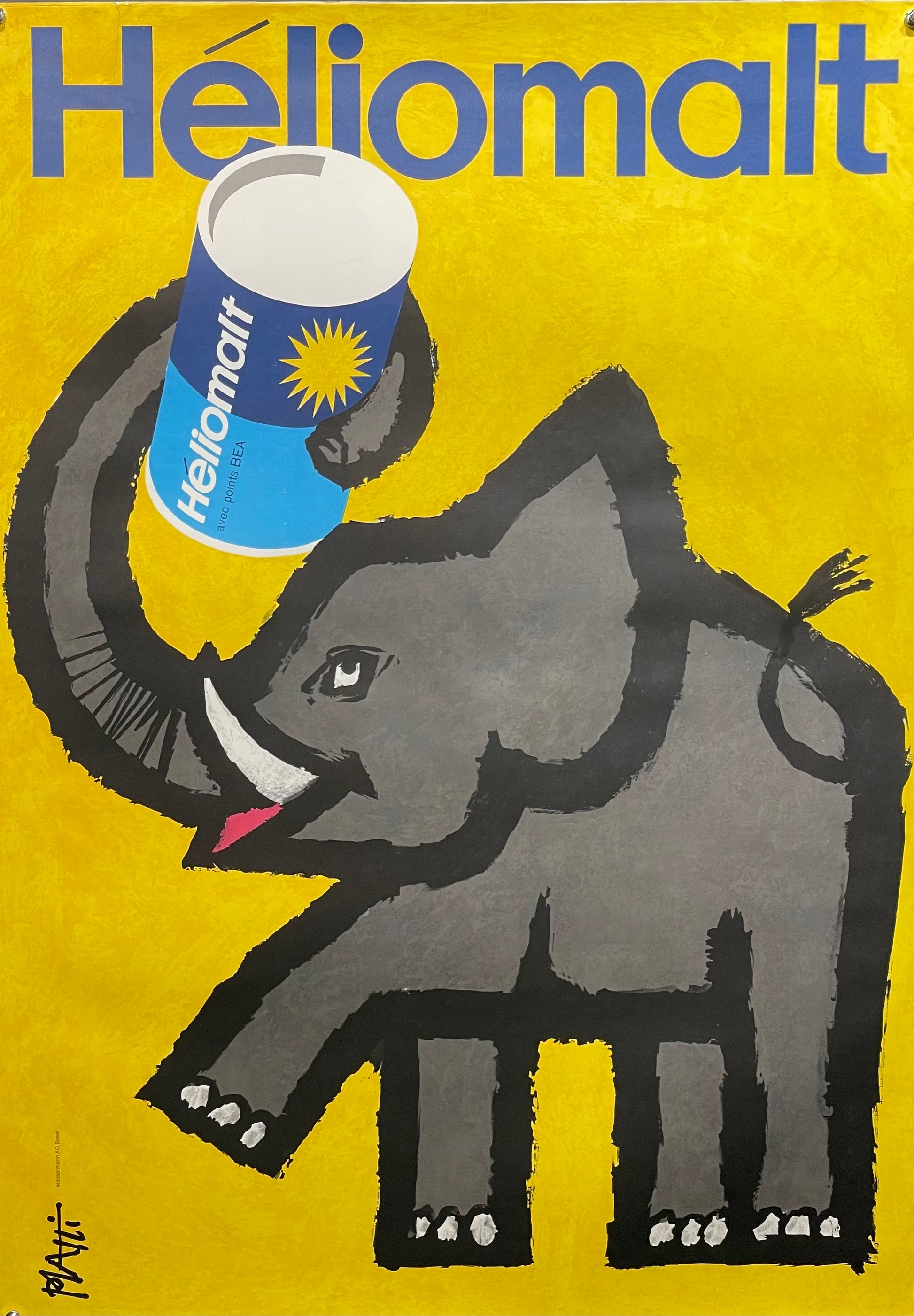 This little grey elephant happily swings his tail and demonstrates that Heliomalt, a product made by a Swiss Dairy Company, containing wheat and barle, has everything you need to be fit and productive all day long.