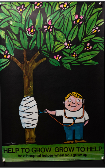 Help To Grow Grow To Help is a poster for a health education campaign, run by the American Hospital Association, to encourage children to consider a career in healthcare.