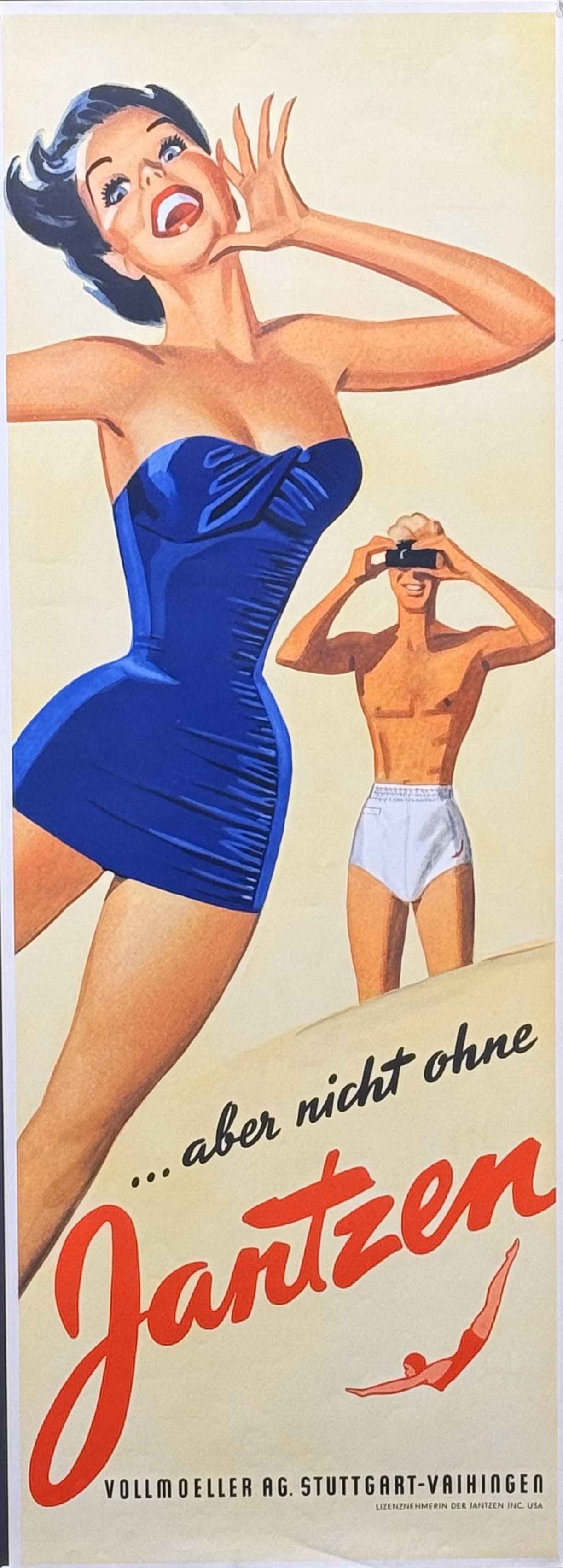 In the 1950's Janzen swimwear adopted the slogan "Nothing does as much for a girl as a Jantzen" and their advertising, often illustrated by artist Peter Hawley, showcased confident and happy young women in their figure-hugging swimwear. While emphasizing the slimming and supportive qualities of the swimsuit, the overall tone of the advertisements was one of joie de vivre. In this German advertisement we see a young man in his Jantzen "trunks" admiring the gleeful bathing belle.