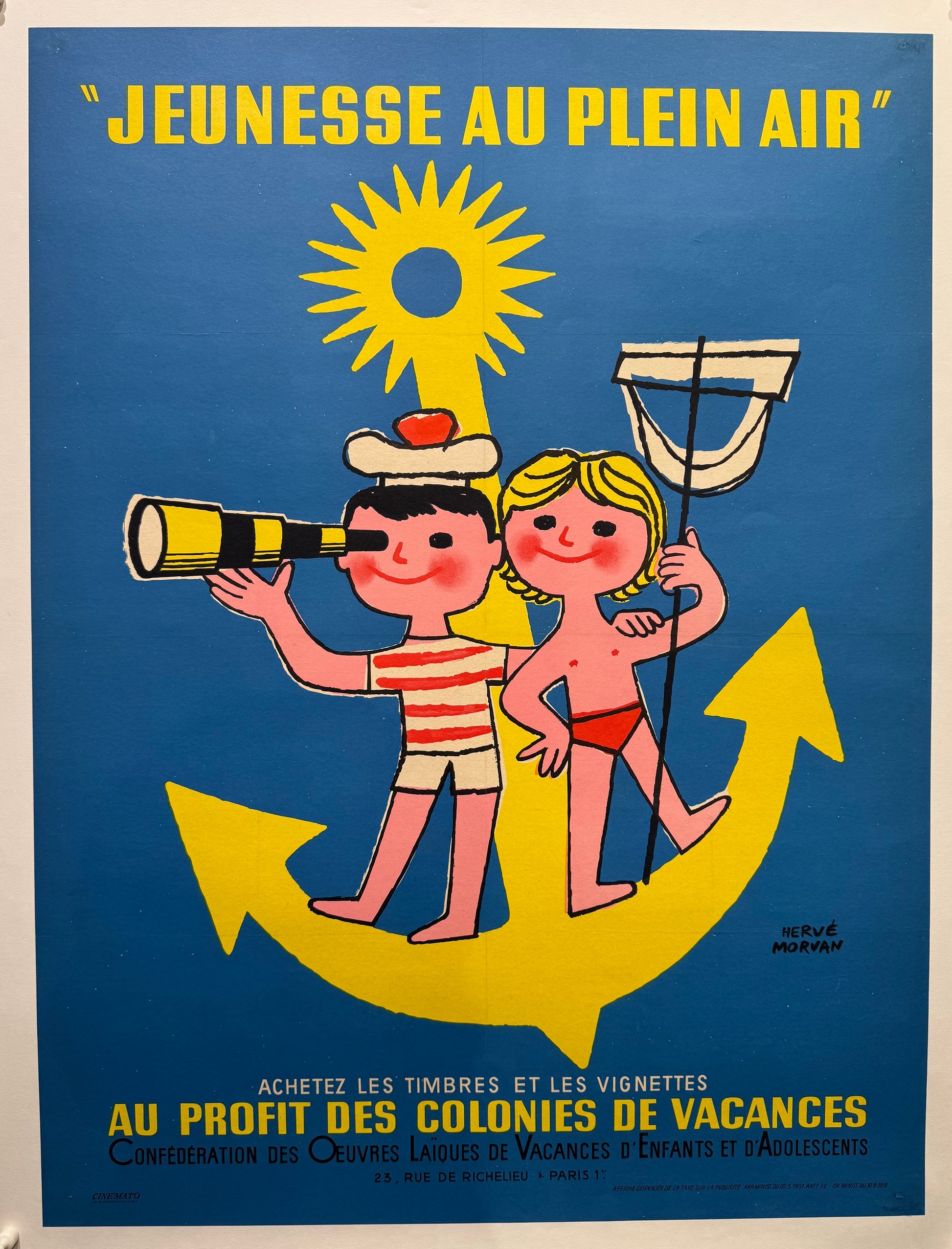 Known for his vibrant and fun posters, this is one of Hervé Morvan's productions for the long-running French program "Youth Outdoors" which promoted outdoor activities, including summer camps, for children, particularly those from underprivileged backgrounds. Morvan created posters for this campaign from 1951 to 1982.