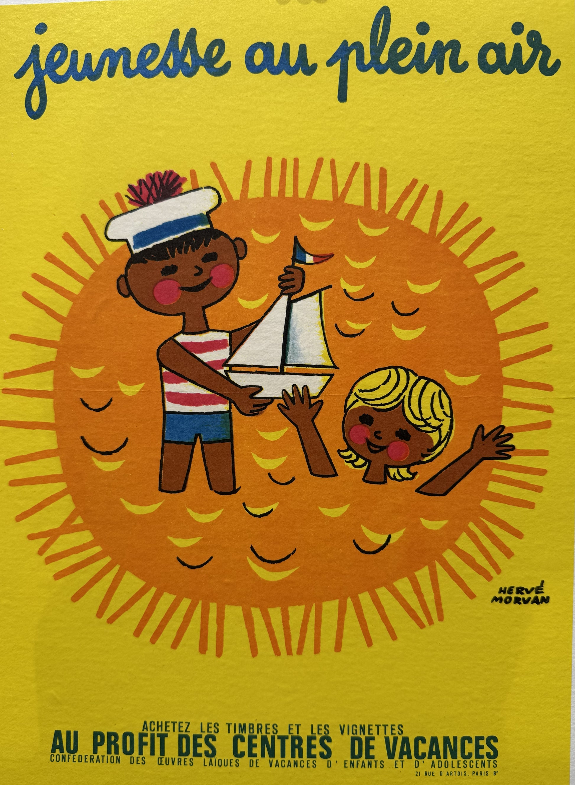 Known for his vibrant and fun posters, this is one of Hervé Morvan's productions for the long-running French program "Youth Outdoors" which promoted outdoor activities, including summer camps, for children, particularly those from underprivileged backgrounds. Morvan created posters for this campaign from 1951 to 1982. See our other Jeunesse au plein air posters;