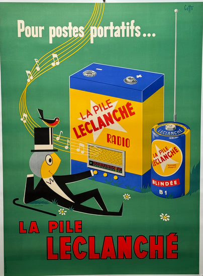 In 1866 French scientist Georges Leclanché invented and patented the Leclanché cell battery. In this 1950's poster we see Monsieur Leclanché (the Leclanché emblem) formally dressed but casually reclining as he listens to a radio powered by the Leclanché cell battery - a 'game-changer', allowing you to take your music with you wherever you go.