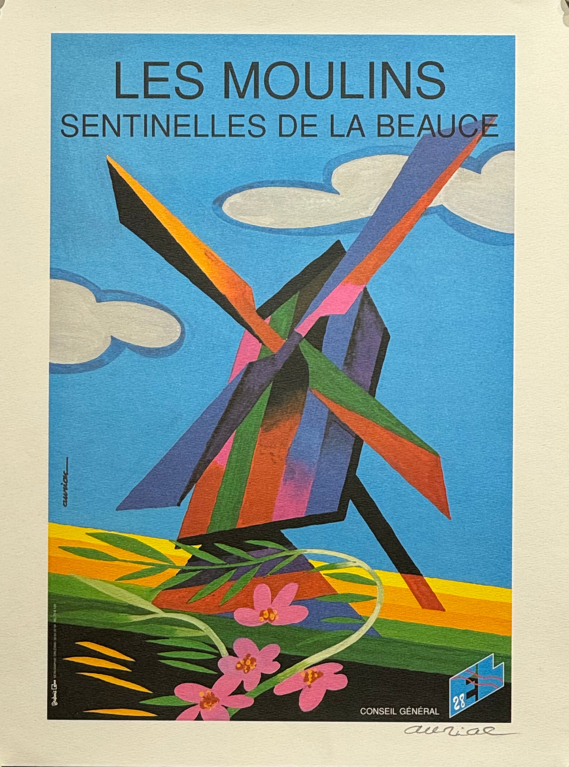 Auric has chosen the pivot windmill to promote the Beauce region of North-central France. With a rich history dating back to the 11th century these fascinating windmills once dotted the agricultural countryside. On the eve of the French Revolution, there were 1789 mills in Beauce, however, today only about fifteen remain.