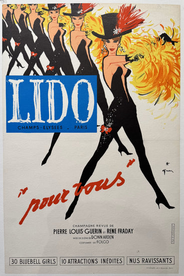 Advertising the bawdy burlesque show "pour vous" for the musical theatre venue Lido, this poster features some of the famous Bluebell Girls dressed to impress. Known for its exotic shows including dancers and singers, this Lido poster from the 1960's promises "ravishing nudes".
