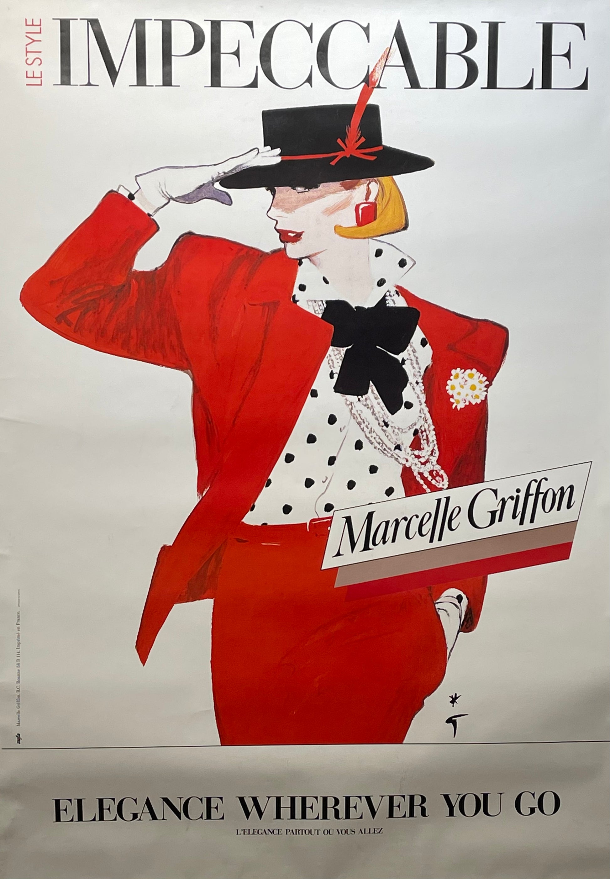 In this original French bus shelter poster created to advertise Marcelle Griffon's ladies' wear Catalogue, we see a stylish model whose black hat and bow compliment her spotted blouse and classicly elegant red suit
