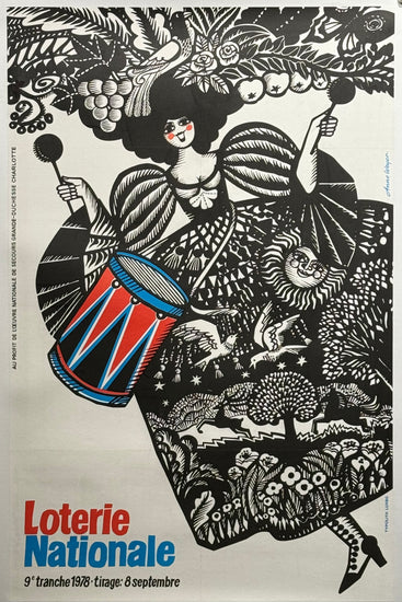 Get ready to play with the Loterie Nationale lady! She's dressed in a unique mix of clothing and headgear, making her stand out from the crowd. This stylish poster will add a fun and playful touch to any room. Don't you just want to grab a pencil and start colouring it in! (Note: No drum included, just a lady with a cool outfit.)