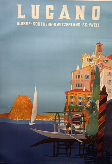 Projecting an Italian vibe, this travel poster for Lugano. which borders with Italy, depicts terraced houses, a sailing boat, and a relaxed lifestyle. With it's temperate climate and long hours of sunshine the city lives up to it's German nickname of Sonnenstube or "sun porch".