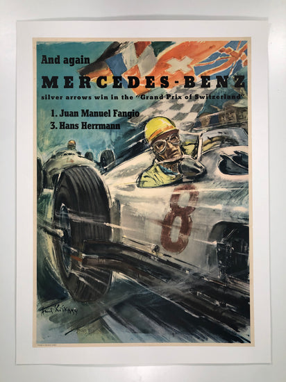 Celebrating the Mercedes-Benz Silver Arrow's victory at the 1954 Swiss Grand Prix. The 66-lap race was won by Mercedes driver Juan Manuel Fangio after starting from second position. The Driver's Championship was decided at this race. Works Ferrari driver Jose Gonzales needed to win to stay in contention however, after finishing 2nd to Fangio, with the rules in place at the time, González could not top Fangio with only 2 races left. So the title went to Fangio for the 2nd time.