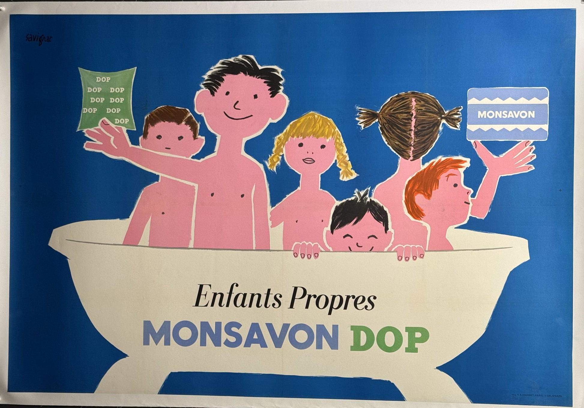 Savignac loved to use humor in his art and claimed that his career began with his 1949 poster, "Monsavon Au Lait" depicting a cow standing on a bar of soap with it's udder draining milk into the bar. His relationship with Monsavon continues here with a bathtub full of clean children bathed with Monsavon soap and DOP shampoo.