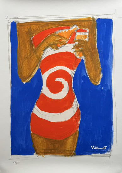 If she has followed the Orangina recommendation to "shake it up" her Orangina will swirl into the glass just like the swirls on her dress. Once again Villemot uses the trademark colours of blue, white and orange this time incorporating his swirl into the dress.