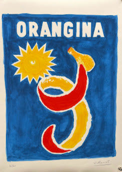 A hot summer sun, a cloudless blue sky and a cool bottle of Orangina. Villemot developed the swirl motif to solve a French advertising regulation that prohibited the depiction of fruit when advertising drinks that contain less than 20% juice. The motif is used in many of his Orangina posters. The bottle shown in the poster is Orangina's signature bottle design featuring pebbled glass which mimics the feel of an orange peel.
