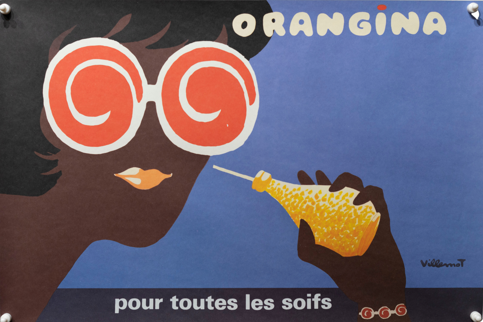 in 1953 Villemot commenced work on the logos and posters for the new soft drink, Orangina. In this bold poster he has chosen to portray his trademark Orangina orange peel swirl logo reflected in sunglasses.