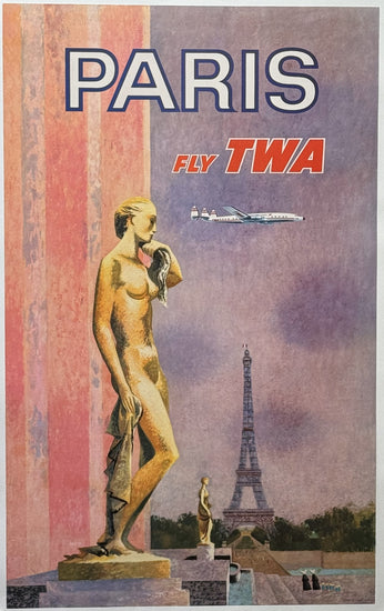 Featuring one of the Golden statues of the Palais de Chaillot with the iconic Eiffel Tower in the background, this TWA poster need say no more - Paris!
