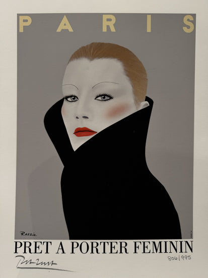 Razzia has chosen to portray an attitude of cool aloofness in his model for the poster he created for the Paris "Prêt à Porter Féminin" (women's ready-to-wear) fashion week. Simple shades of black and white with a few colour highlights accentuate the áttitude' of the image.