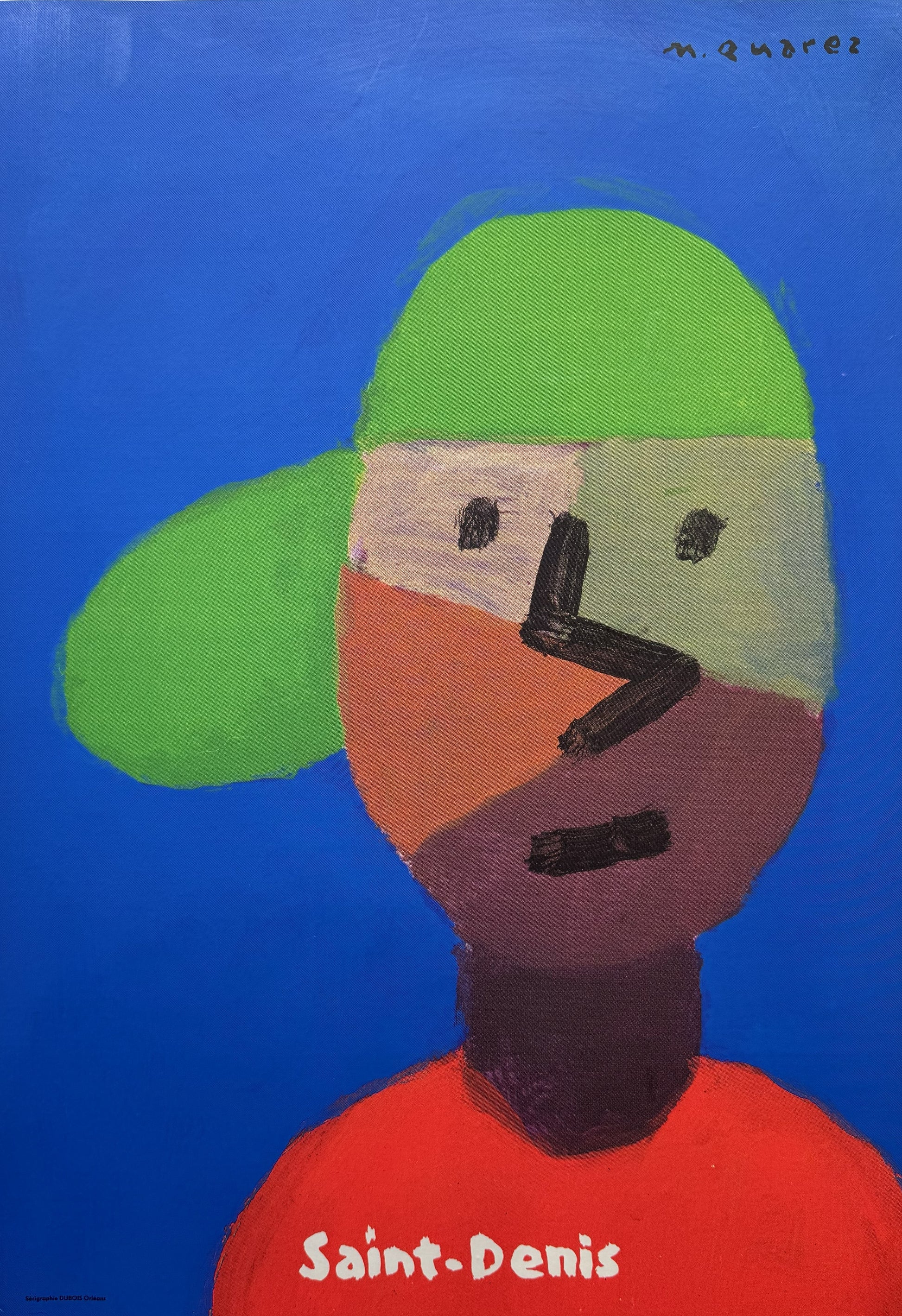 A striking and quirky poster by Michel Quarez for Saint-Denis, a historical subub in the north of Paris where he lived. Perhaps this poster was designed to reflect the highly diverse and mixed population of the area. Known for its rich multicultural identity, with residents representing over 130 nationalities. it is often described as a hub where "France meets Africa",