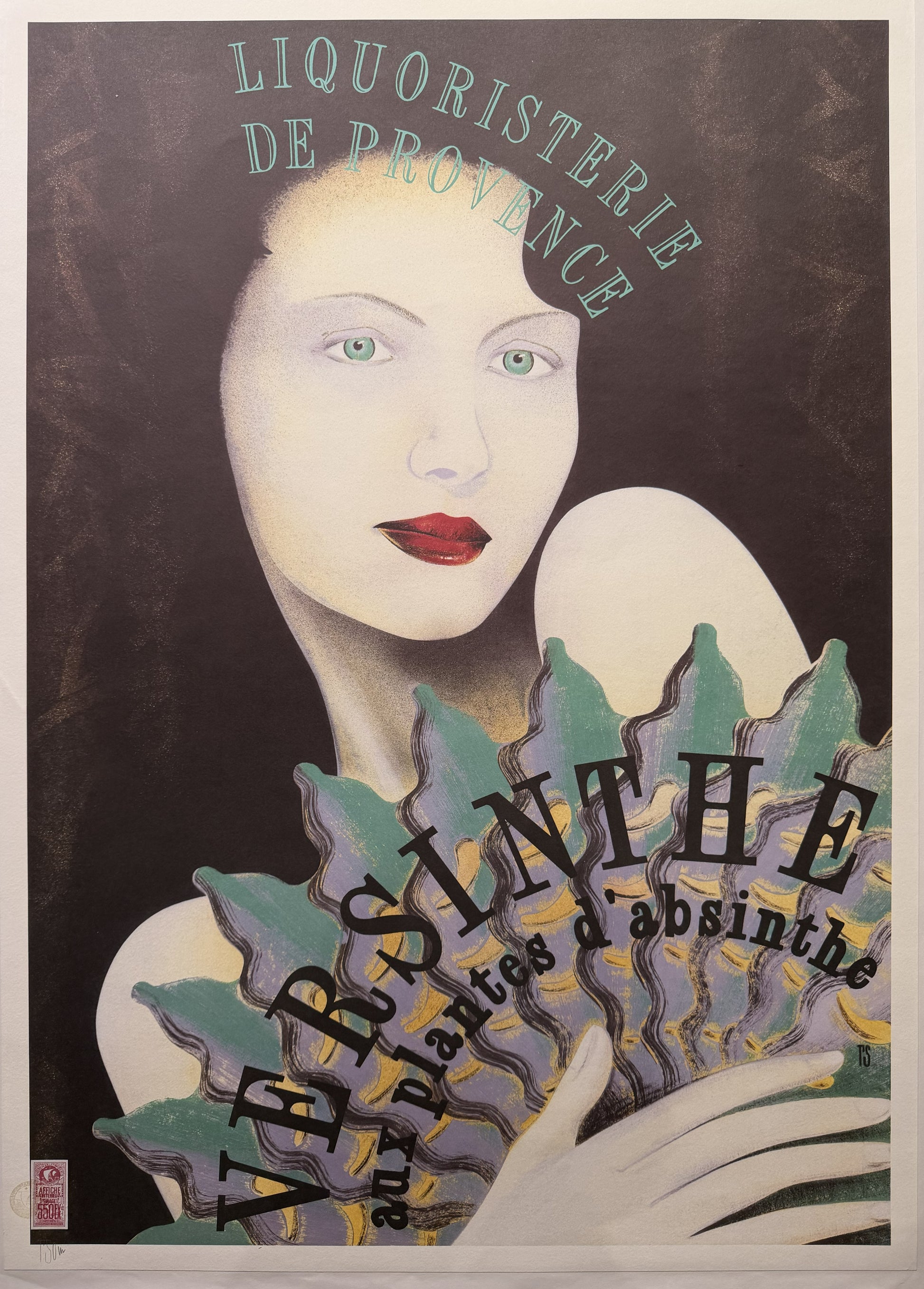 In a subtle but clever play on a theme, Sommer has incorporated the green colour of the absinthe in the woman’s eyes and the perforations of the absinthe spoon in the fan’ that she is holding. green fairy