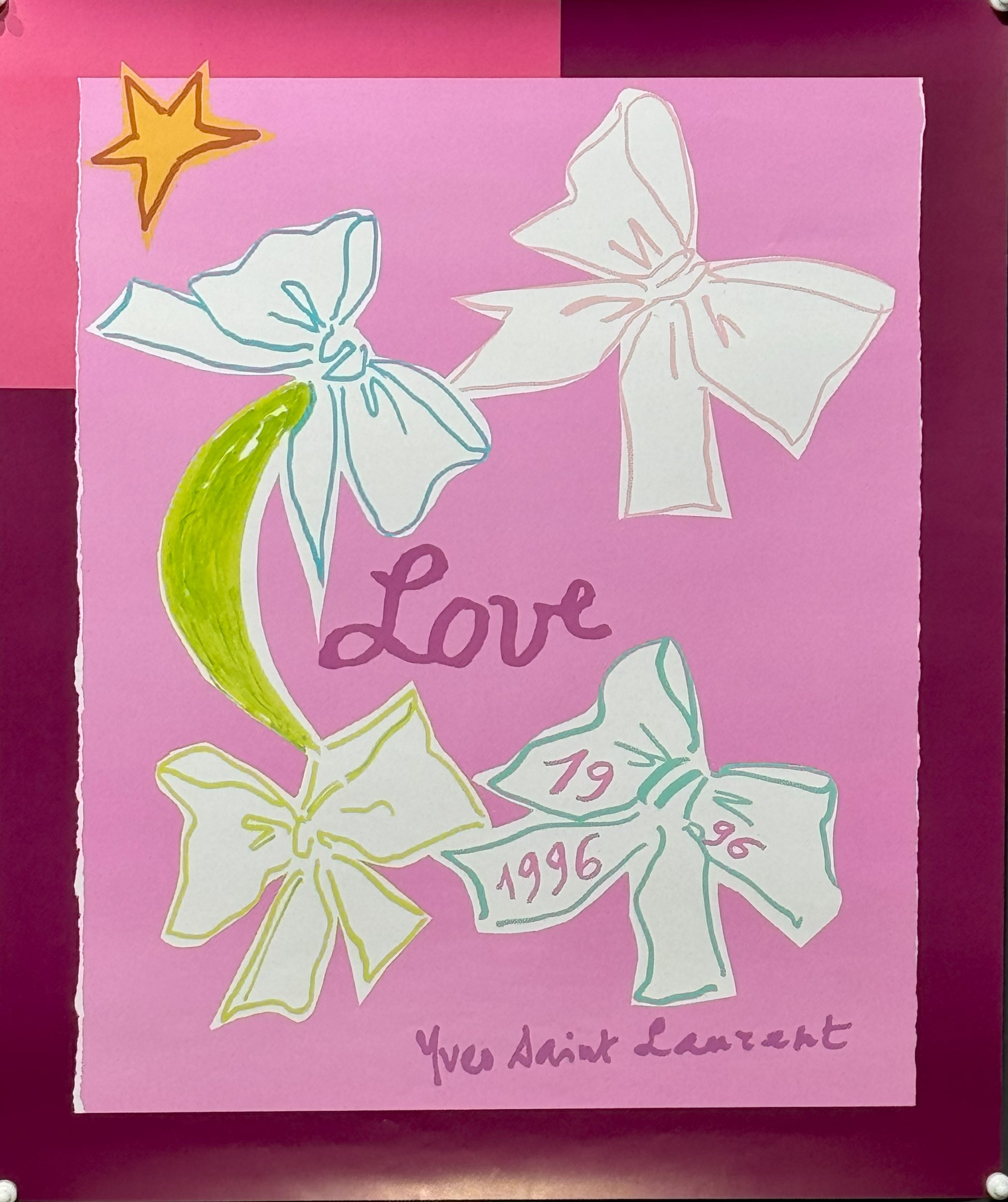 In 1970, Yves Saint Laurent designed the first in a series of greeting cards in poster form that he would send his friends, collaborators, and clients annually. While the leitmotif of every card was the word “LOVE.”, the designs are as individual as the designer himself, incorporating collage, drawings, and gouache and every year adopting a new color palette. This poster, along with all the posters from 1970 to 2007, is on display in the Jardin Majorelle Marrakech.